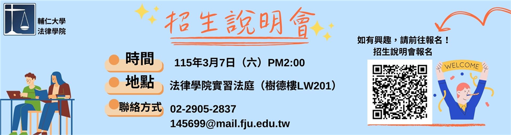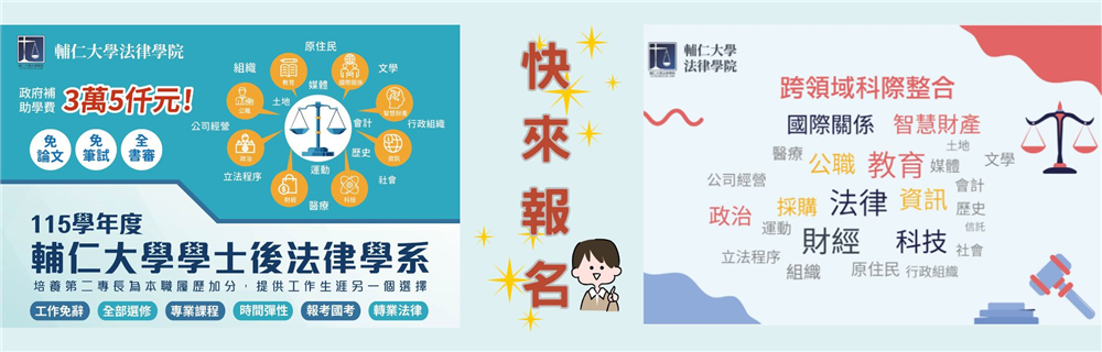 | 歡迎報名~~第十五屆輔仁大學法律學院中國人民大學法學院學生圓桌論壇 (延長報名到1/14 ) 學術活動2025/12/18 | MORE |