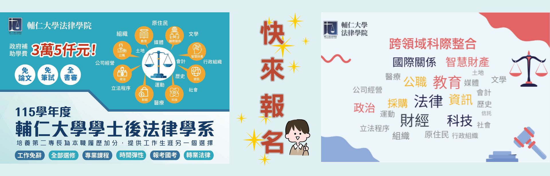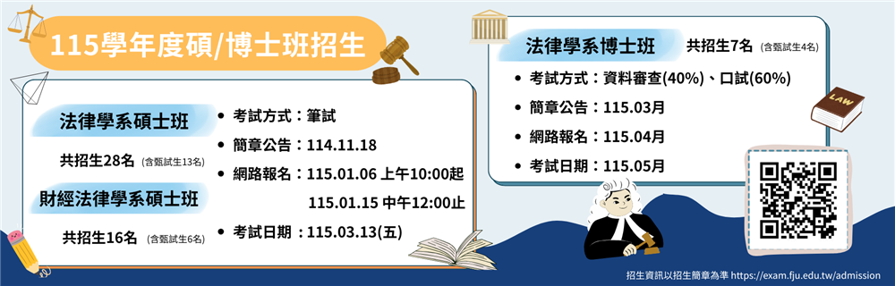 | 114學年度 學士後法律學系-入學考招生資訊 招生公告2025/1/15 | MORE |