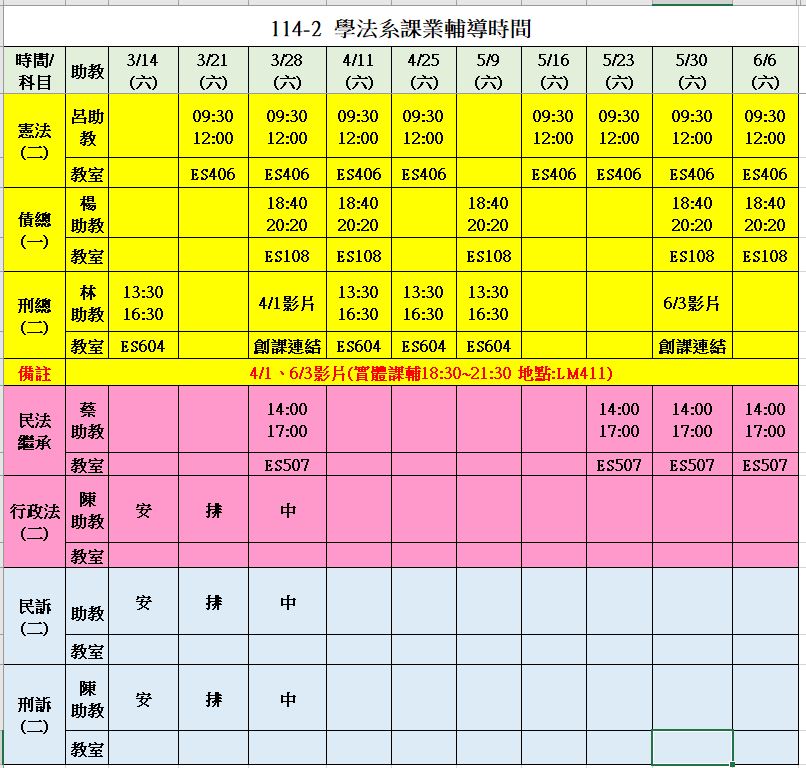 <憲法>、<債總>、<刑總>課輔,進度以助教所負責科系班級為主。