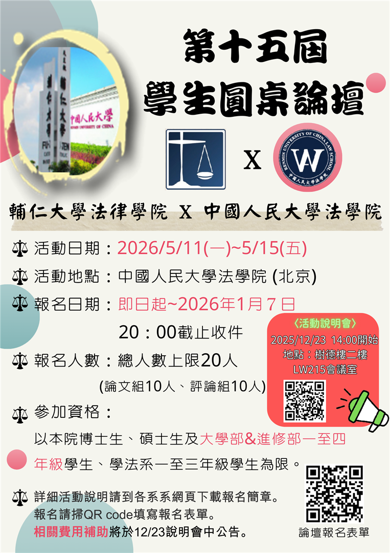 歡迎報名~~第十五屆輔仁大學法律學院中國人民大學法學院學生圓桌論壇