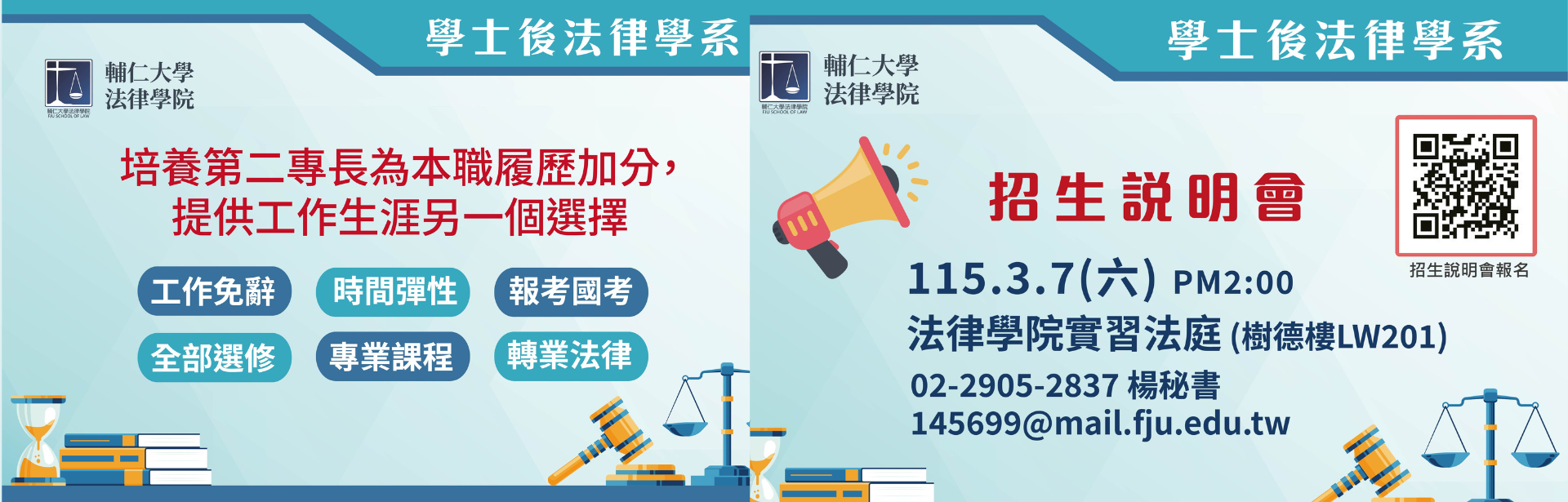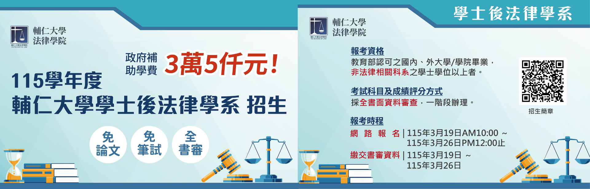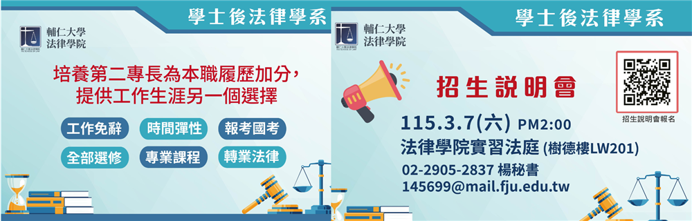 | 115學年度 學士後法律學系-入學考招生資訊 招生公告2026/1/21 | MORE |