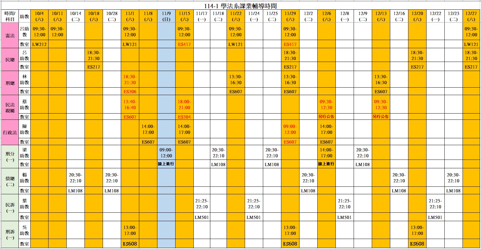 大一<親屬>、<行政法>、<憲法>、<民總>、<刑總>已安排!